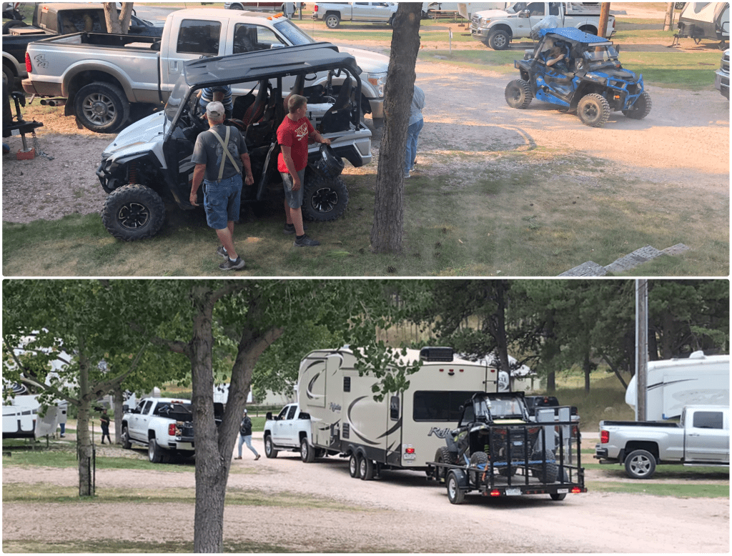 ATVs, that is, all-terrain vehicles, also known as “Quads,” are as prevalent in the Black Hills as jet skis are in the Florida Keys – and just as much of a nuisance to those, like us, that don’t drive them. UTVs – utility terrain vehicles – are close cousins, the difference being that ATVs are ridden by a single individual, straddled like a motorcycle, while UTVs carry multiple passengers seated side-by-side, more like a high-powered golf cart. In the campground, both versions were everywhere, buzzing around like mosquitos at all hours. Most of them had been towed in on trailers which, in turn, were towed behind 5th-wheel RVs or travel trailers which were being towed behind pickup trucks, like the combo in the bottom of the photo, below (this is illegal in 22 states):