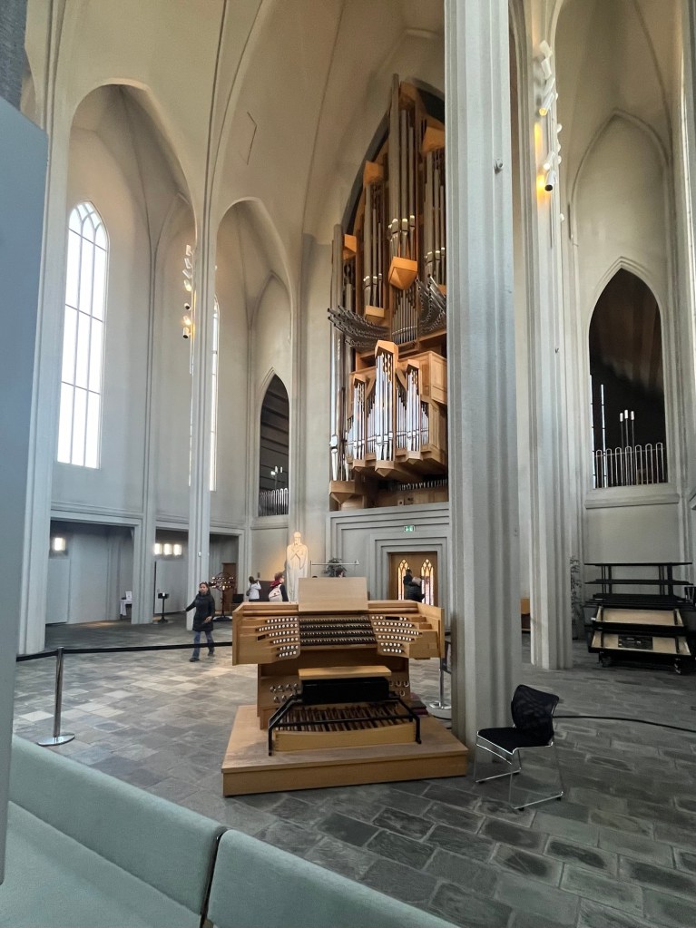 After watching the geese and ducks swim around at Hlif-mumble-mumble-dur, we walked uphill to the one-of-a-kind Lutheran church known as Hallgrímskirkja. The church is the largest in Iceland and at 245’ one of the tallest man-made structures on the island.