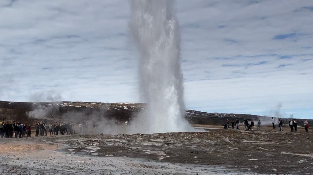After Gullfoss, we backtracked a few miles to appropriately named Great Geysir, the namesake of all geysers. The Great Geysir is now mostly dormant, but it’s nearby little brother, Strokkur, below, erupted about every 20 minutes while we were there, throwing boiling water about 100 feet in the air.