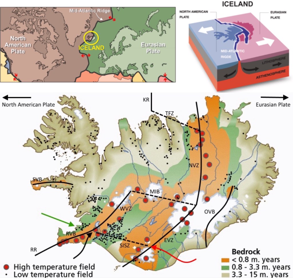 The orange colored areas on the map, below, mark the location of the youngest rock in Iceland where volcanic activity is most likely to be found as the plates separate. The current eruption at Grindavík is just below “RVB” on the map, below, at its bottom left. Thingvellir NP is the red dot the black arrow is pointing to.