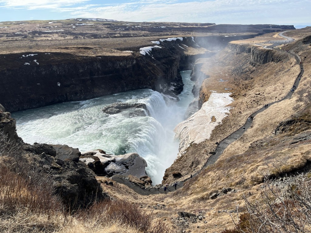 After Thingvellir, we drove east to Gullfoss. One word you will quickly learn in Iceland is “foss.” It means “waterfall,” and they’re everywhere. “Gull,” by the way, means “gold,” hence, Gullfoss is the Golden Waterfall.