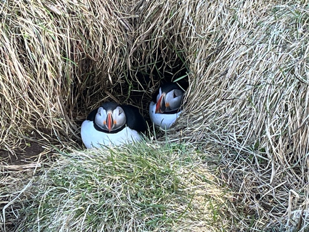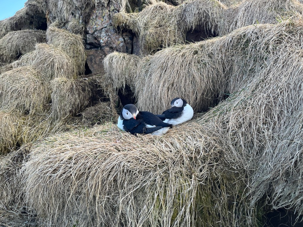 Puffins nest in the burrows they dig where the female lays her single egg. They return to the same burrow year after year.