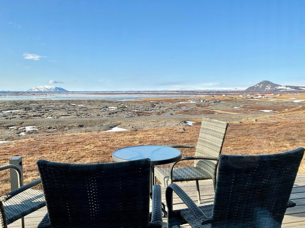 We stayed at another Fosshotel near Mývatn, a shallow lake surrounded by an area of active volcanism. Here’s the view from the hotel looking across the lake.