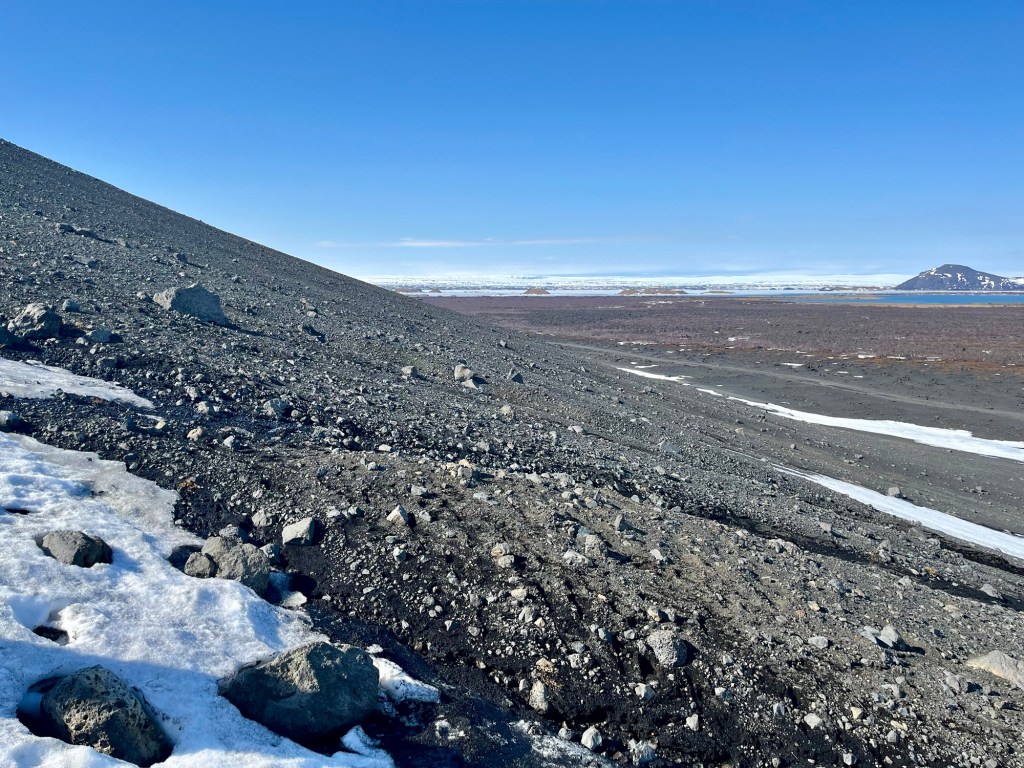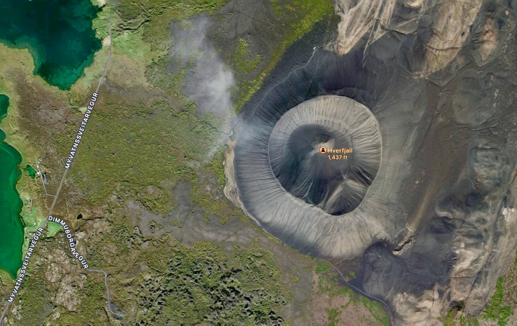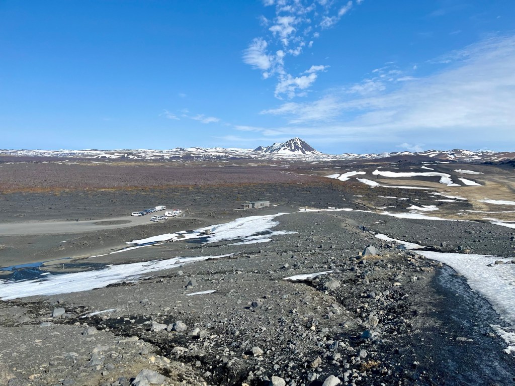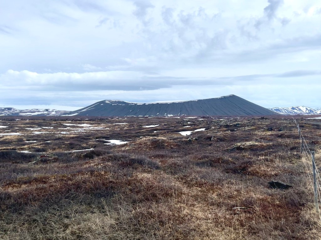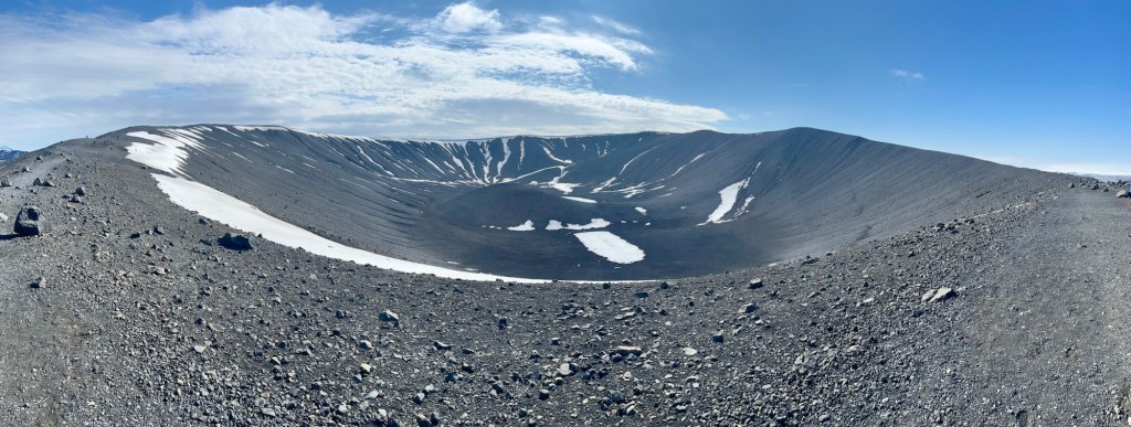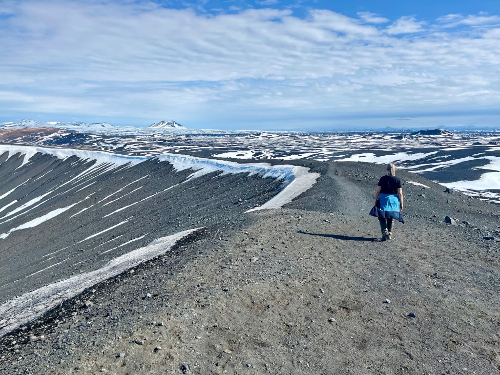 To the southeast, below us, was a lava field (the brownish rock), left by the explosion of Hverfjall.