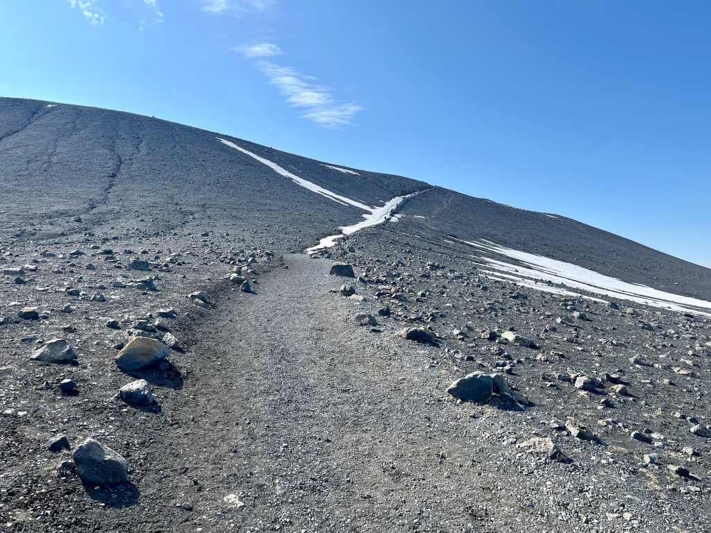 It’s a fairly steep climb up to the rim, probably around a 10° slope most of the way, but perhaps as steep as 15° in a few places. The slope inside the volcano is about twice as steep, varying between 20° and 30°.