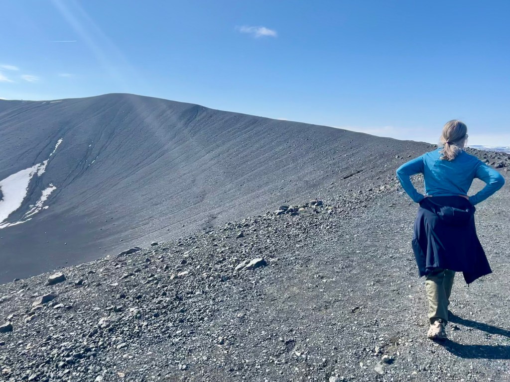 Our main purpose for stopping at Mývatn was to hike the Hverfjall caldera (elev. 1,437 ft.), a fairly symmetrical crater left by an exploding volcano about 2,500 years ago. That’s it, below, from a distance: