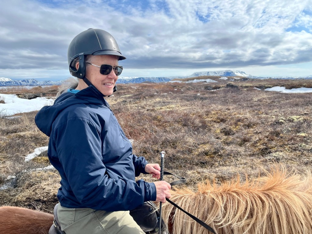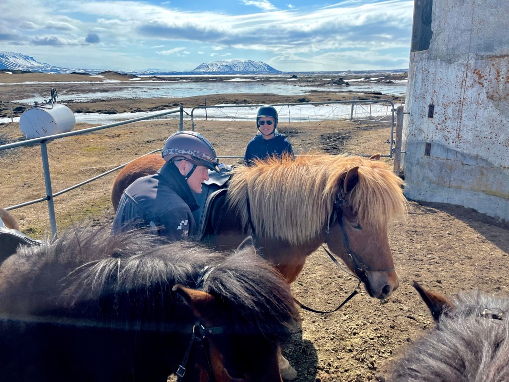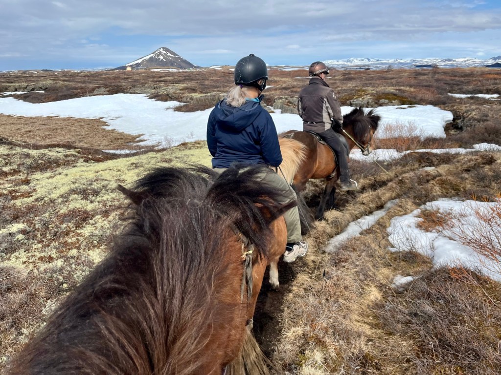 From the farm, we headed off on an improved trail along the lake’s edge, learning as we went that Icelandic horses are trained differently. They’re not “steered” like horses in the USA. You have to hold the reins in separate hands, whereas, in my limited experience elsewhere, I’ve been able to control the horse with the reins in one hand.