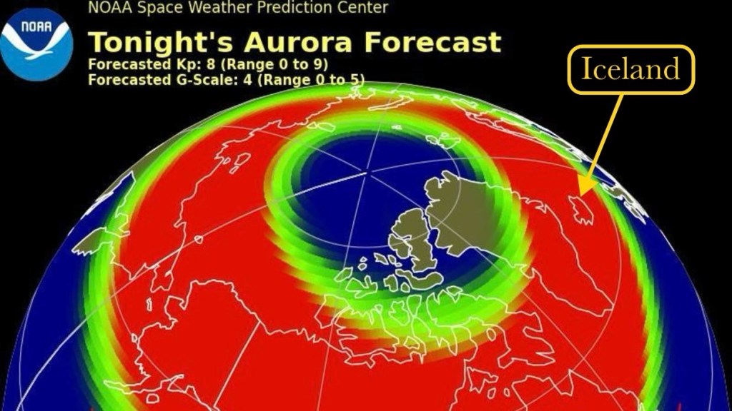 Settled into our room, I checked the weather and news and learned that a solar storm was predicted with the expectation that the aurora borealis, that is, the Northern Lights, would be visible from Iceland that night!