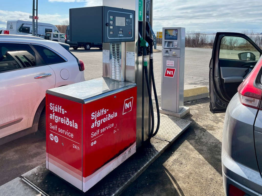 Fuel – Gas is expensive, around $9.00/gal while we were there, and gas stations are few and far apart. I never let the tank drop below half-full. The gas pumps are all fully automated. Many stations had no attendants at all. And the pumps are a little tricky. I often encountered two credit card readers with only one being compatible with my American credit card. They call gasoline “petrol” or “95” (which is the octane rating). Do not confuse the nozzle with the diesel one: gasoline is green.