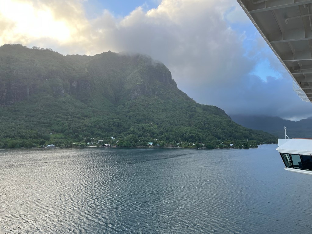 It took less than two hours for the cruise ship to sail from Pape’ete to Mo’orea, accomplished as we slept. Here’s a view of Mo’orea as we approached on the morning of October 12: