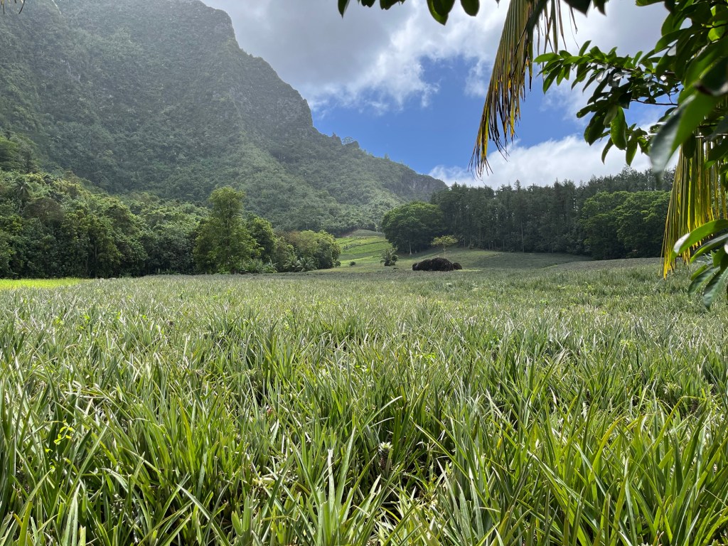 Our next stops were at a river to see freshwater eels (bottom left, above) and a pineapple plantation (bottom right). You can see the pineapple fields behind Dale and our guide in the photos, above and below.