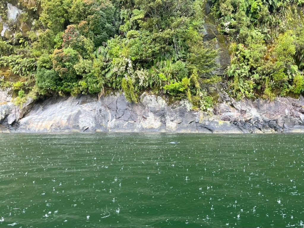 Land Ho! (Those white marks are raindrops hitting the water surface; the bigger splash is a Fiordland Crested Penguin diving.)