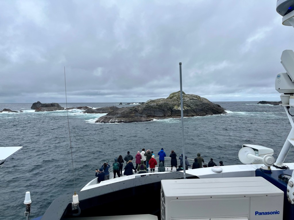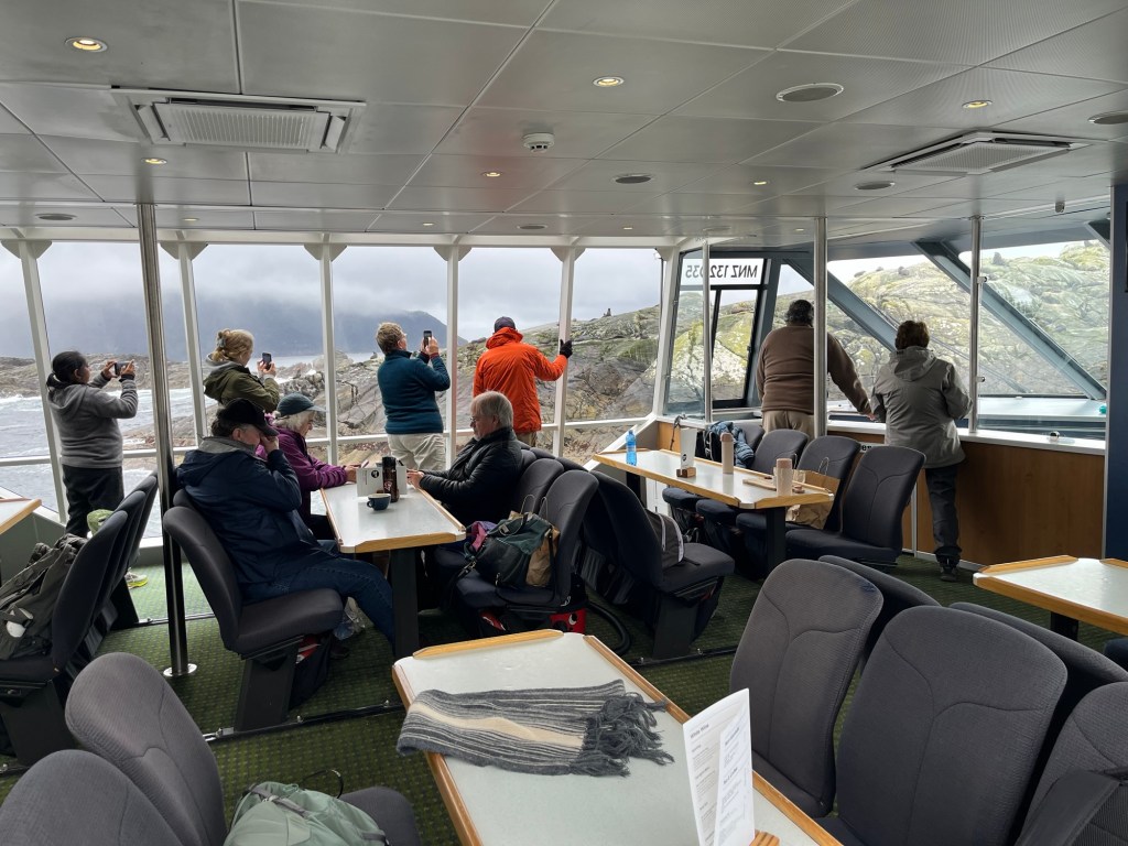 I climbed up to the top deck where I was completely alone. As we neared the island, I went down to the floor below where Dale and about a quarter of the other passengers were observing our approach, ogling the fur seals on Nee Island.