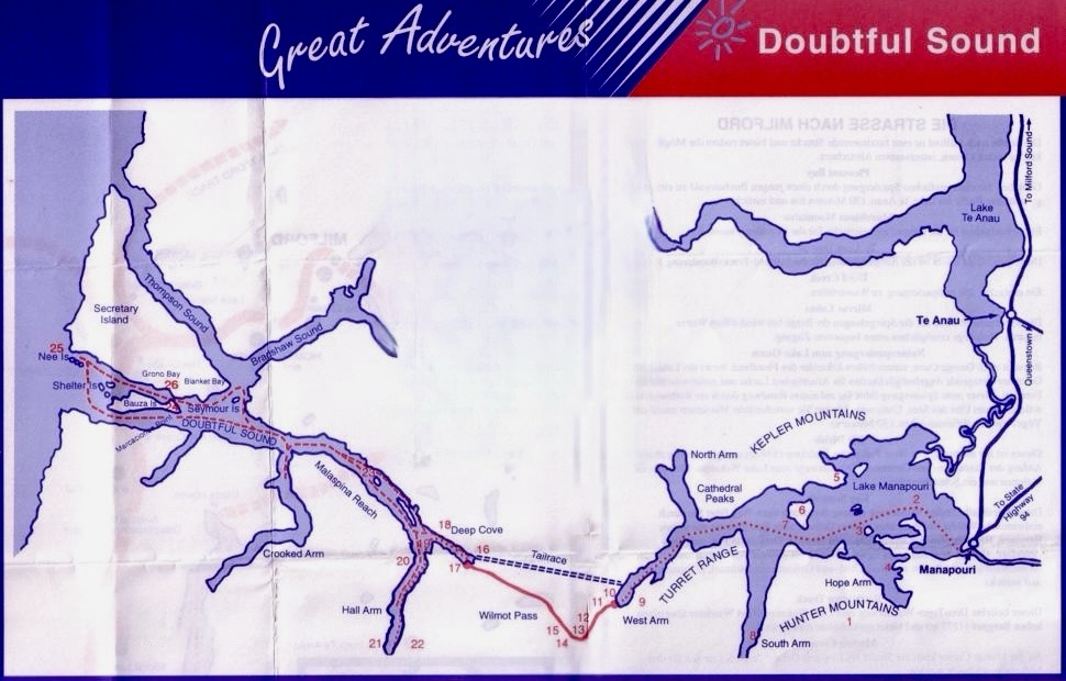 After docking at the western end of the West Arm of Lake Manapouri, we climbed aboard a bus that took us up and over Wilmot Pass (elev. 2,200 feet) to Deep Cove where we boarded a second boat for a tour around Doubtful Sound.
