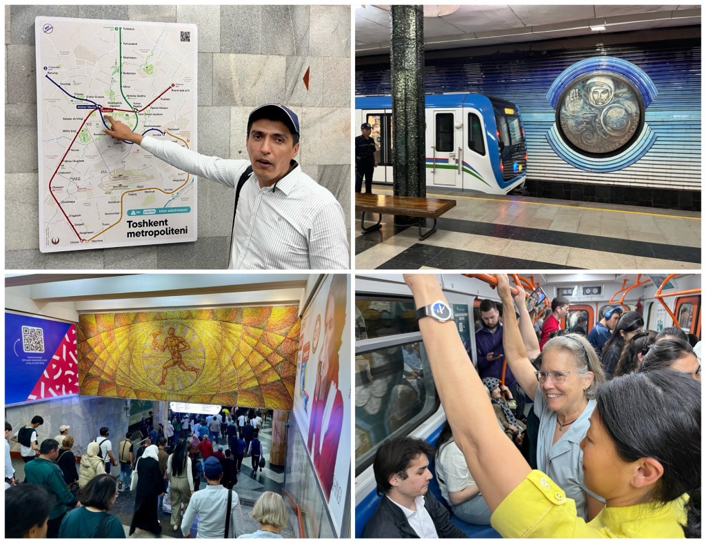 We then went underground to take a ride on the mostly-subterranean Tashkent Metro. We descended to the Cosmonaut station where we caught a train to another station and switched lines (Ahror is pointing out where we started, below):