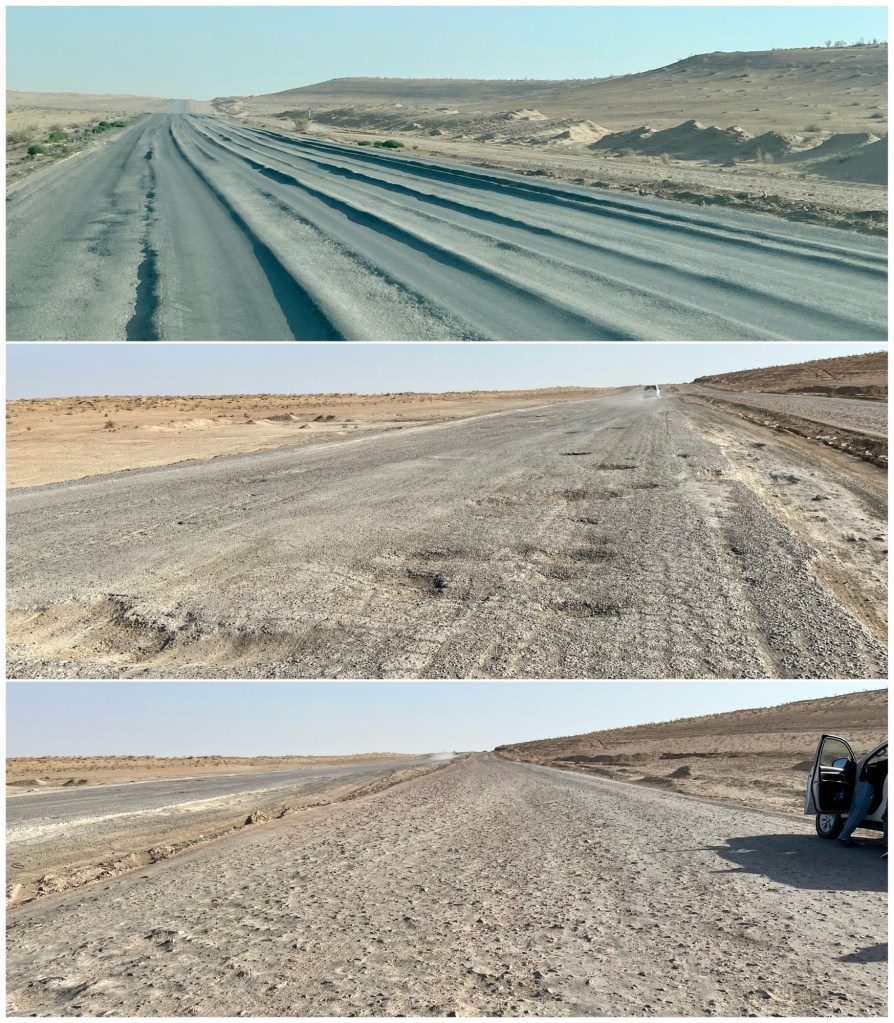 The road across the Karakum is unlike anything I’ve ever driven. In places, the pavement has become ridged as the summer heat melted the asphalt (the pavement can exceed 150° F) and trucks sank into the surface (top photo, below). Elsewhere, potholes were deep enough to destroy a car’s suspension (middle). The best roads were the graded rock ones lacking pavement (bottom). Our guide said most of the pavement, where it existed, is less than eight years old. The elements simply destroy anything built out here.