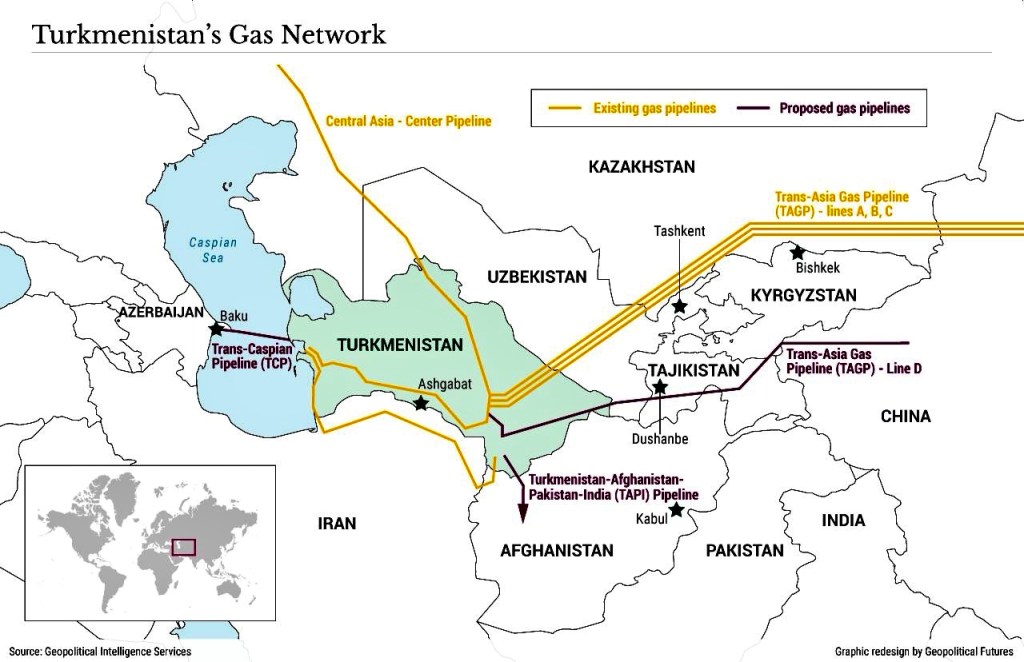 Most of Turkmenistan’s natural gas is exported to China via the pipelines shown below. The main gas fields are in the southeast part of the country where the pipelines start.