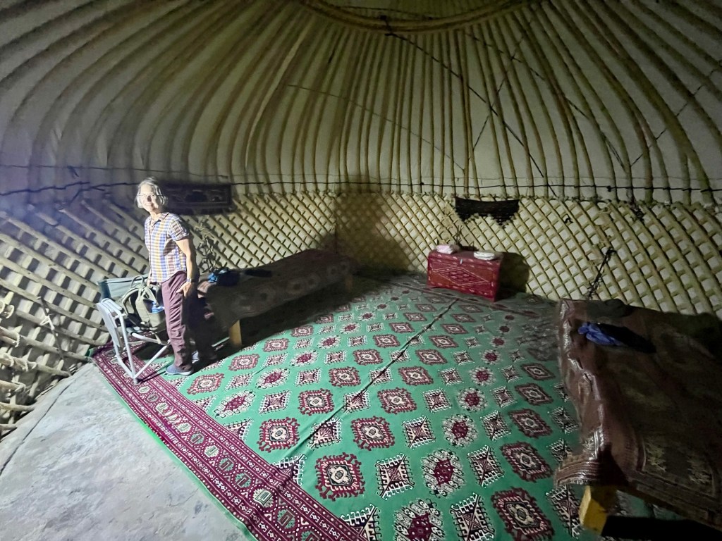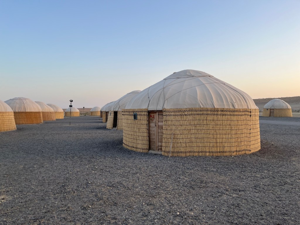Here’s the view as we arrived at the Darvaza crater, our camp for the night in the background, a village of yurts.