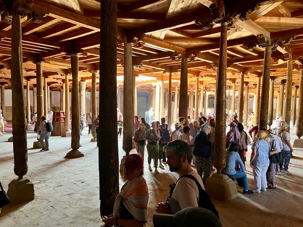 We found our way over to Juma Mosque whose origin dates back to the 900s AD. The mosque was rebuilt in 1788. It’s a single-story brick building with a flat roof supported by 212 unique wooden columns in 17 rows, each column a work of art.
