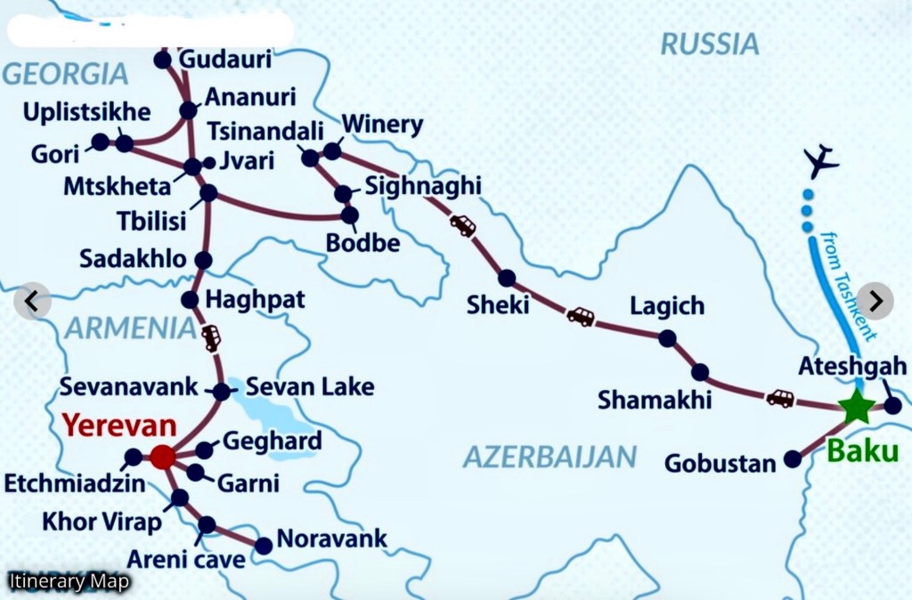 Our tour organizer, Advantour, mixes and matches its various country and city tours to create multi-destination itineraries like the one we’re doing, the Silk Road Essentials tour, the second half of which is 14 days traveling through the South Caucuses countries: Azerbaijan, Georgia and Armenia, in that order.