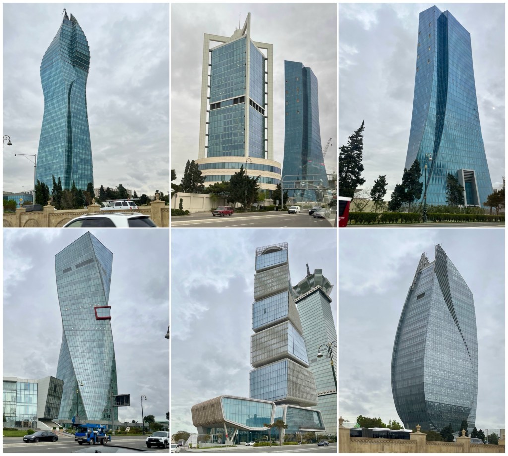 On the drive in from the Baku airport, we passed a number of unusual high-rise buildings on Heydar Aliyev Avenue, most likely funded by oil revenue. At least one of them was, anyway, the SOCAR Tower, owned by the State Oil Company of the Azerbaijan Repubic (top left) and completed in 2016.