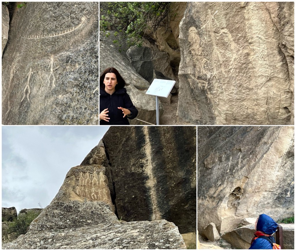 Earlier that afternoon, we drove about 25 miles out of town to the southwest to see the petroglyphs at Gobustan State Historical and Cultural Reserve (that’s our guide in Azerbaijan, Elnara, top right in the photo, below).