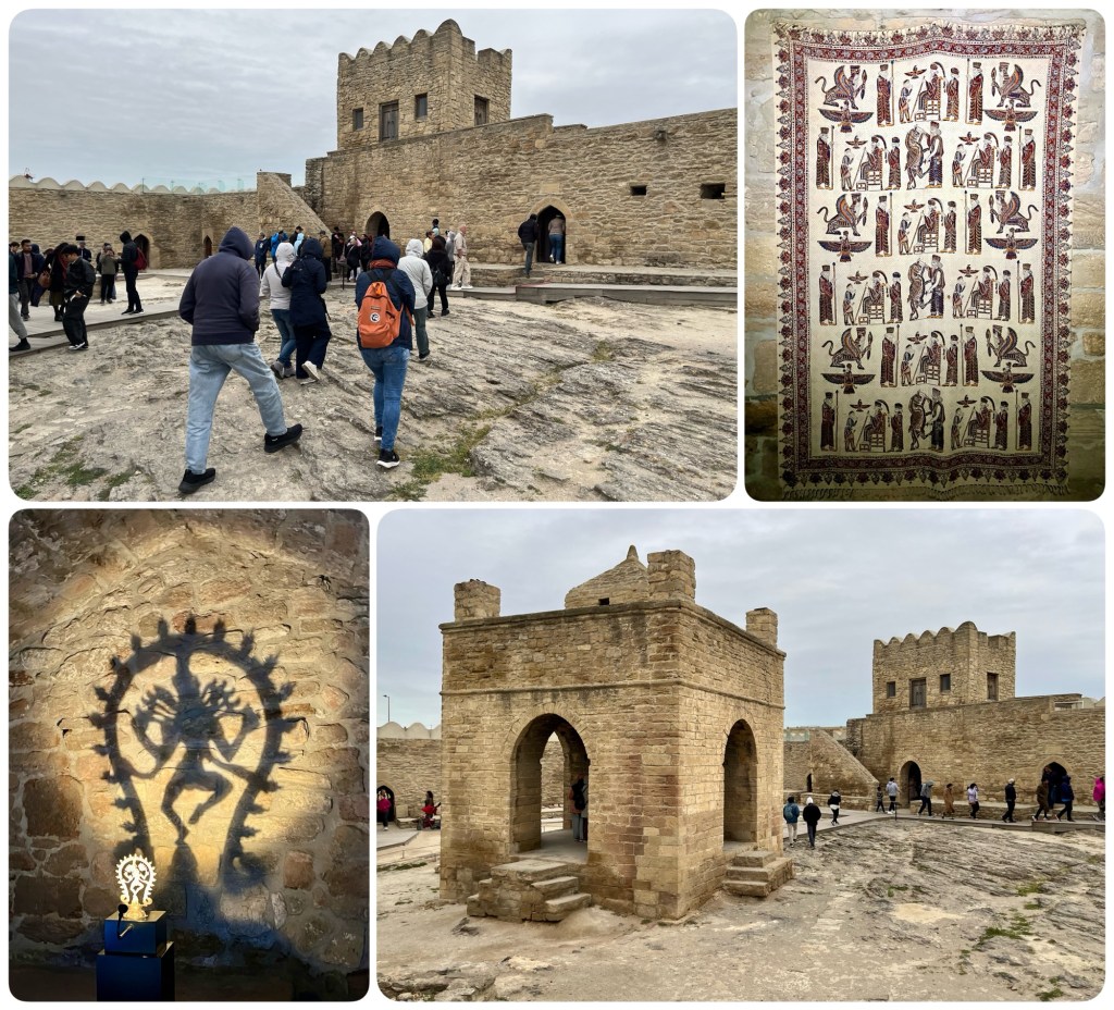 This Zoroastrian temple was built in the late 1600s at the location of a natural gas vent in the ground by Hindu traders on the Silk Road so that they had a place at which to worship according to the traditions of their ancient faith. The Hindu connection was apparent from the artifacts here, as Behram, our Indian/Kiwi companion, a Zoroastrian himself, helpfully explained.