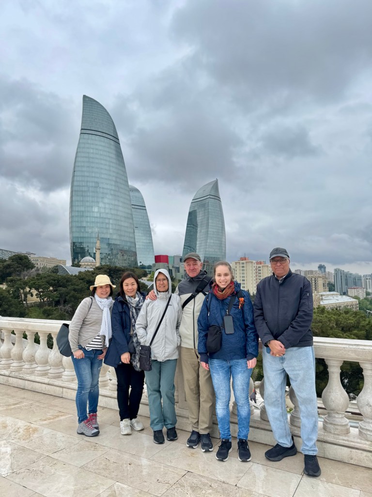 Below is a photo of our traveling companions for the Azerbaijan leg of our travels with the Flame Towers in the background: Karen and Clara, high school friends from Singapore (one now living in Hong Kong); Serena, from Italy; and, Behram, an Indian now living in New Zealand. Like in the -stans, we were the oldest of the bunch.