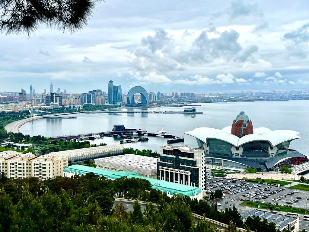 Looking to the northeast from the same place, the Baku Panoramic Viewpoint, is the city skyline, including the upside-down crescent moon hotel still under construction. We are staying at the Radisson Baku, a little to the left of it.