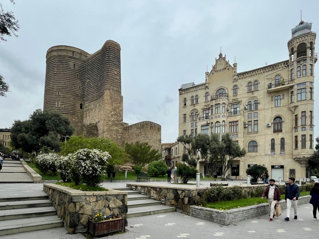 Growing a little weary, Dale and I decided to leave the group and walk back to the hotel while our fellow travelers drove off to visit the Heydar Alyev Cultural Center. As we walked down to the promenade along the waterfront, we passed by the Gyz Galasy, also known as the Maiden Tower, pictured below.