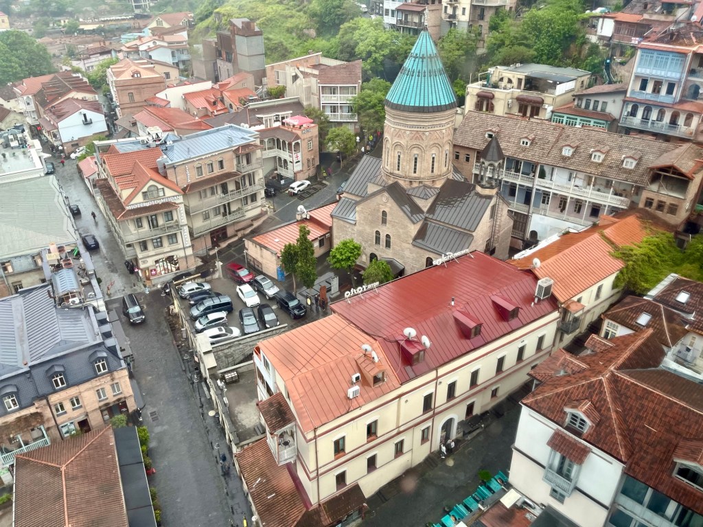 Just past Europe Square, we hopped aboard the Mother of Georgia Tramway, a cable car, that took us up to the top of Sololaki Hill next to the Narikala Fortress. Here’s the view from the cable car on the way up with the Zion Cathedral of the Dormition, prominent in the center.
