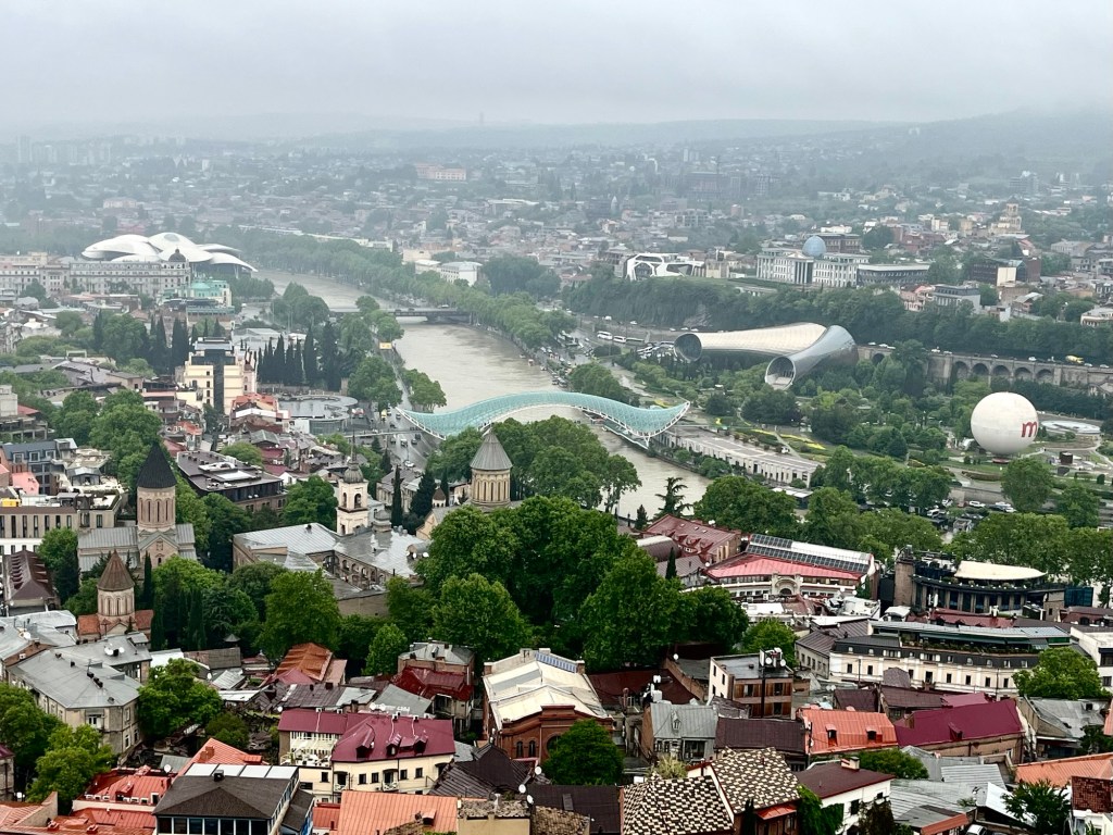 Here’s the view from the top of Sololaki Hill. That glass bridge over the Kura River is our next stop: the Bridge of Peace.