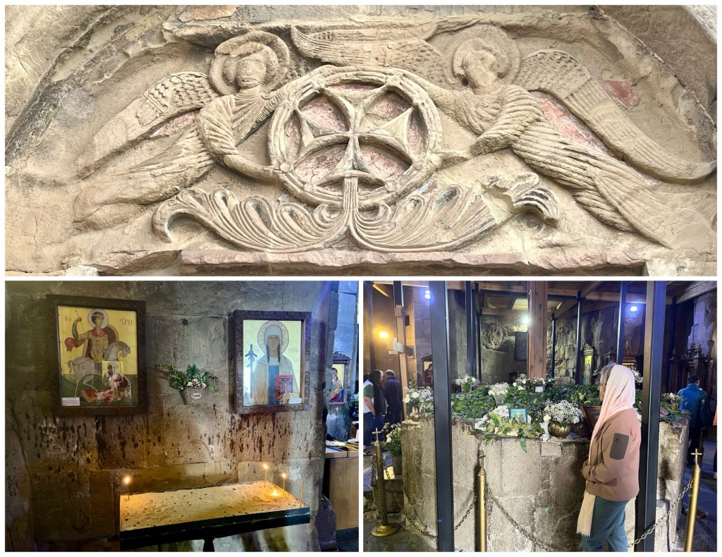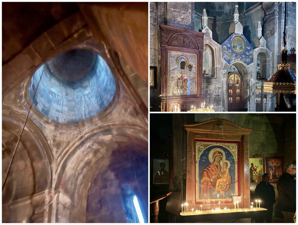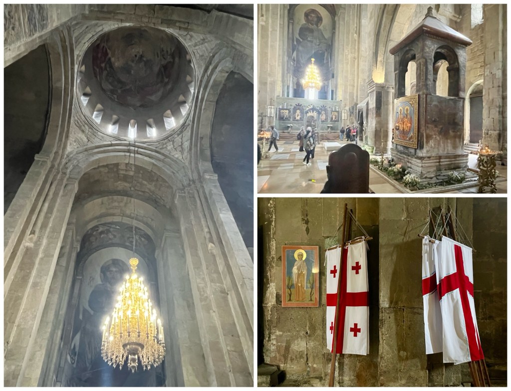 One of the things that makes Svetitskhoveli Cathedral so revered is that it purportedly houses a famous relic, Christ’s robe, kept under the ciborium shown in the photo below, top right.