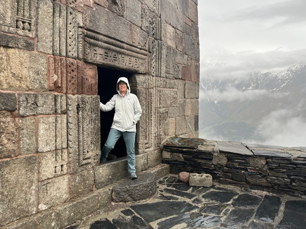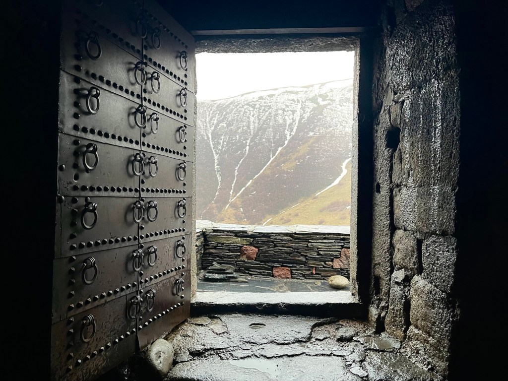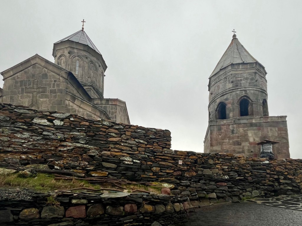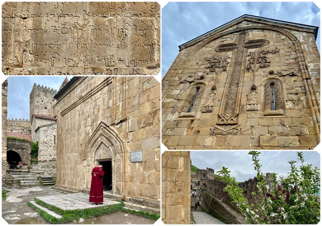 Due to its remote location, relics from other Georgian Orthodox churches were brought here for safe-keeping during times of invasion. You enter through the building on the right, sort of a guard tower.