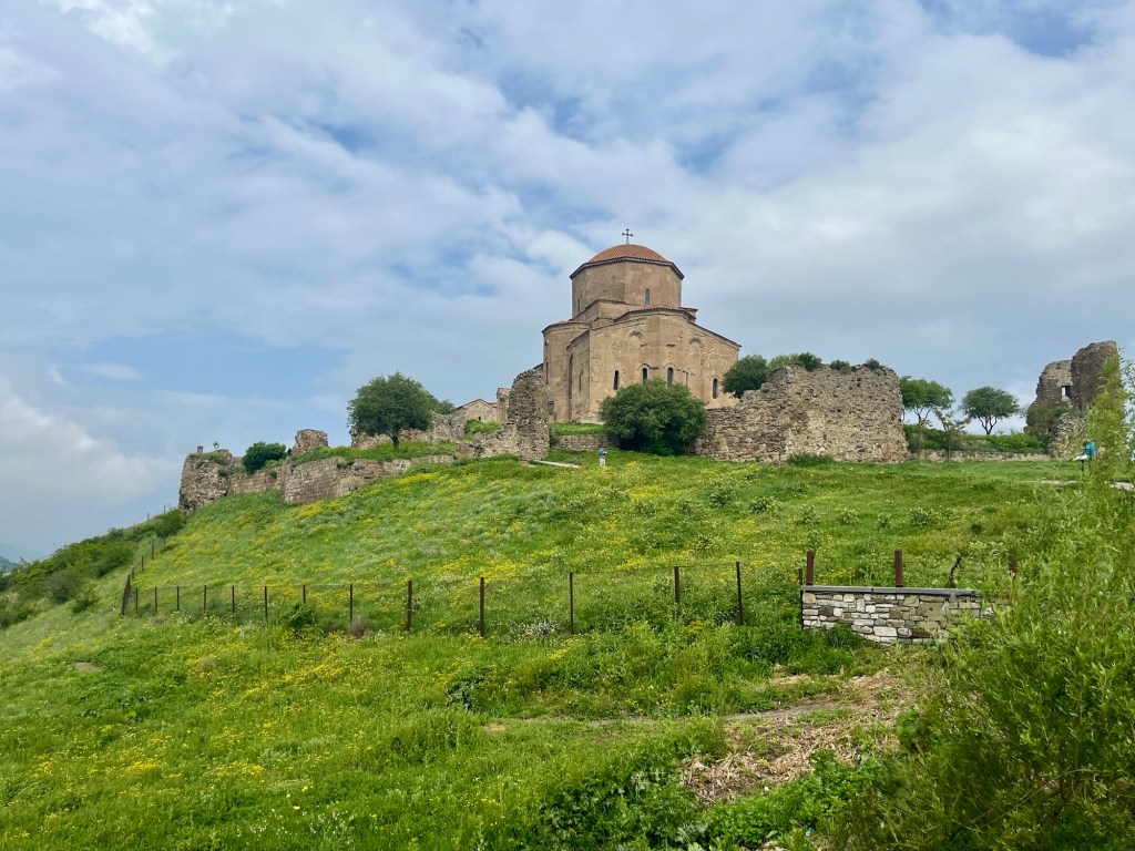 The Jvari church is in the same state today as when it was built over 1,400 years ago. Its design was copied across the realm: a cross with a longer section running east, arms running north-south, and a dome at the intersection supported by the church’s walls.