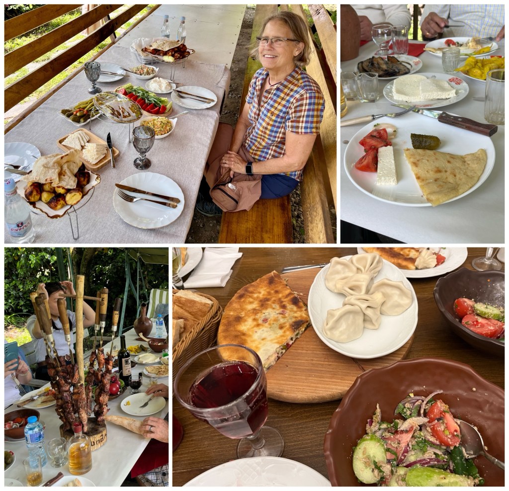 My favorite dish on the trip has been Georgian khachapuri, similar to a quesadilla (top right) or a calzone (bottom right), depending on the locale and the chef. Another Georgian favorite is khinkali, a type of dumpling (bottom right). And in every country, we’ve had kebab, grilled skewered meat (bottom left), either beef, lamb or chicken.