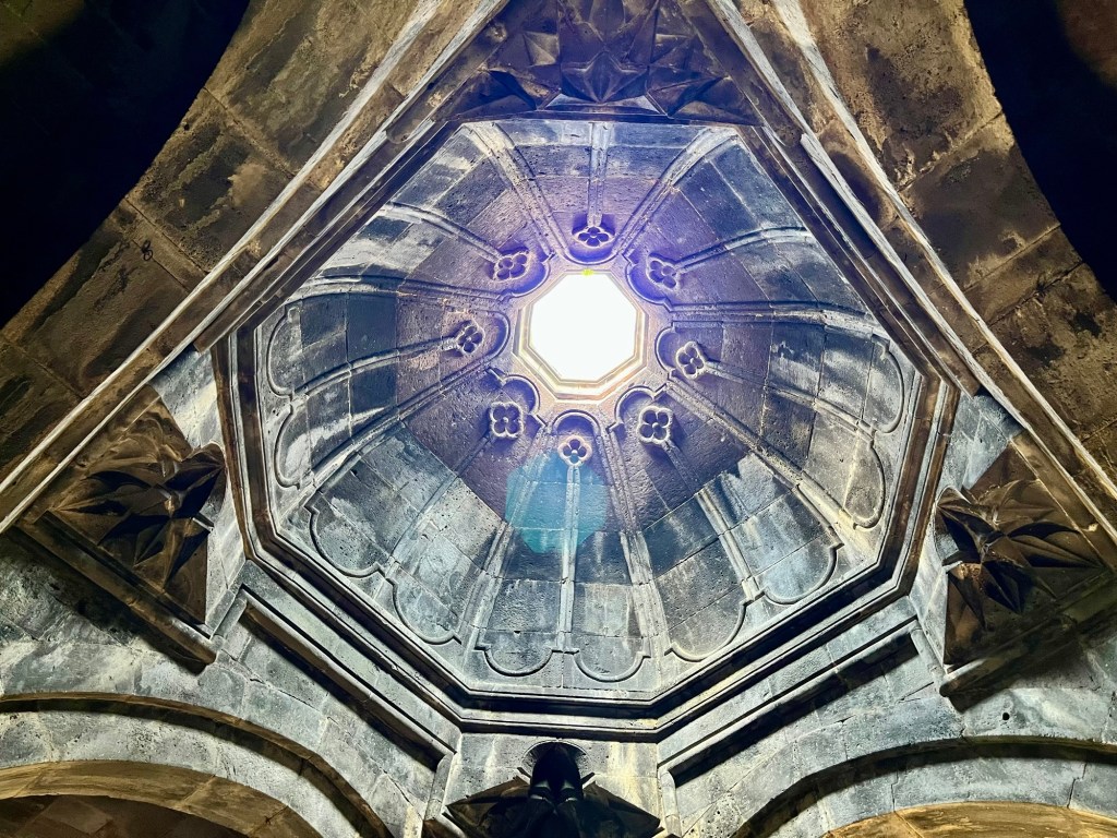Rima led us through the archway shown in the photo above and into the adjacent part of the monastery complex, past several cross stones, known as Khachkars, leaning against the walls. Khachkars are essentially artistic tombstones, typically depicting an Armenian cross above a rosette or inscription. The tradition continues in Armenia to the present.