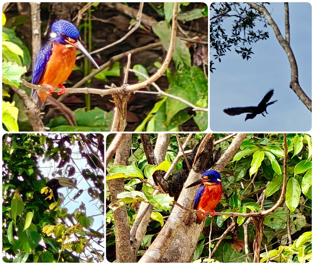 We returned to the lodge for lunch, looking for birds along the way, and spotting a Blue-Eared Kingfisher and a Black Hornbill, perched (bottom left) and in flight. That double-bill on hornbills helps them resonate and broadcast their distinctive honking call.
