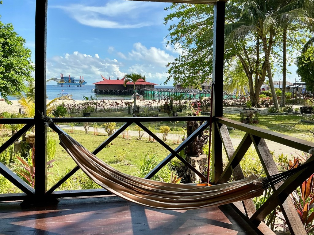 Below is the view from our patio. That red-roofed building is the dive center. Beyond it, that blue structure is an old oil drilling platform turned diving resort.