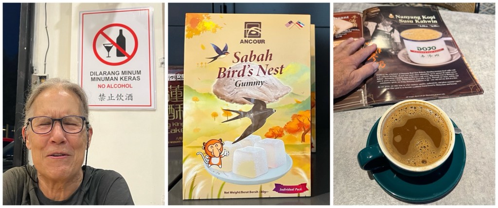 Our final meal was at the Dojo Kopi house. No alcoholic toast tonight. The specialty at Dojo is their Nanyang Kopi, a delicious coffee drink, similar to what we enjoyed in Vietnam. The hotel’s convenience store had Sabah Bird’s Nest Gummis. Pass.