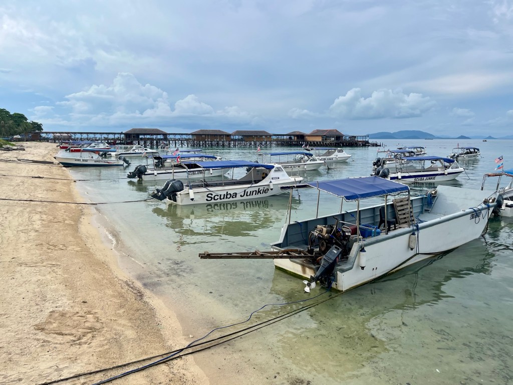 Scuba Junkie’s lodging is called Mabul Beach Resort. It’s south of the beach at the foot of a long pier. At the end of the pier is the boat landing and dive center. You can see it on the map above and in the photo, below.