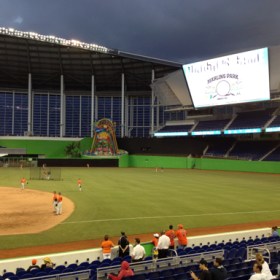 We’re at the Miami Marlin’s first game in their new stadium against the University of Miami Hurricanes (it’s an exhibition game) with our friends from Germany, Suzanne, Frank and Lennart. We have great seats by first base. It’s a good thing that there’s a sliding roof because it looks like rain tonight.