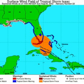 We spent yesterday and this morning preparing for Hurricane Isaac’s arrival. Here’s the current position: Isaac is projected to get to Hurricane Category 1 status about the time it hits us in the Florida Keys. This will be the first hurricane to make landfall in the Keys in 7 years. We’re expecting sustained winds of … Continue reading