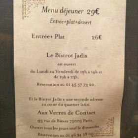 The other day, walking down the nearby Rue de la Croix-Nivert, we passed the Restaurant Jadis, but it wasn’t open at the time. We looked at the notice on the door and thought that €29 for the menu du jour at a good restaurant might be nice, so we filed it away for future reference. … Continue reading