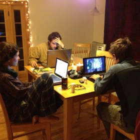 Trevor was a bit tired when we got back from mountain biking. Dale got busy preparing pumpkin cheesecake. Kyle cooked a steak on the BBQ while Kelly made vegetables. While everything was cooking, we had a computer face-off. After dinner, it was time to open presents. Trevor gave us Buffalo Bills winterware.